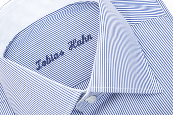 Des Weiteren bietet Fine Cotton Company auch eine größere Stickerei an, die in der Schulterinnenseite des Hemdes eingestickt wird. Die Favoriten unserer Kunden sind zum Beispiel der Vor- und Nachname, sowie bei Hochzeitshemden die Namen und das Datum des zukünftigen Ehepaares. Einige Kunden bevorzugen aber auch einen lockeren Spruch oder ihr Lebensmotto. Wenn das Hemd verschenkt werden soll, eignet sich dieses Feature zu einem netten Gruß. Auch hier gilt: wer die Stickerei dezent bevorzugt, wählt die Garnfarbe passend zum Hemdstoff, also Ton in Ton. Durch die Stickerei wird ihr Hemd einzigartig und Sie können sicher sein: So ein Maßhemd hat keiner außer Ihnen.